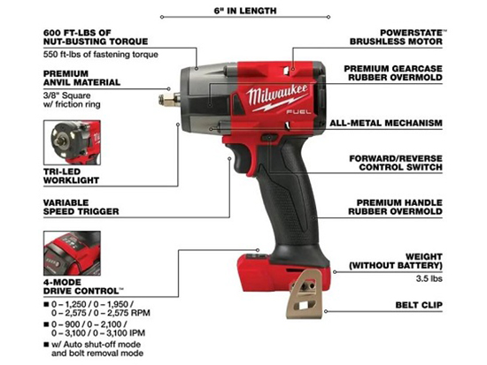 Our M18 FUEL™ 3/8" Mid-Torque Impact Wrench w/ Friction Ring delivers the best power to weight ratio, most access in tight spaces, and faster removal speed. It provides 600 ft-lbs of nut-busting torque and only weighs 5.0 lbs, making it extremely versatile, capable of performing a wide variety of applications. Its POWERSTATE™ Brushless Motor generates the power needed to quickly perform many tasks, such as removing large bolts or lug nuts.